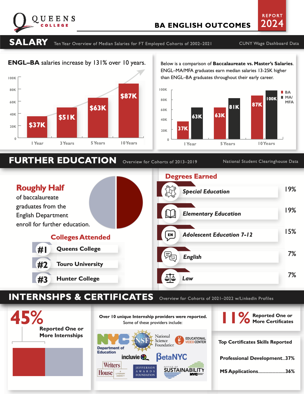 QC English major alumni outcomes, 2024 report: Queens College data on how much alumni make, where alumni go for further education, and the types of internships and certificates that our alumni earn